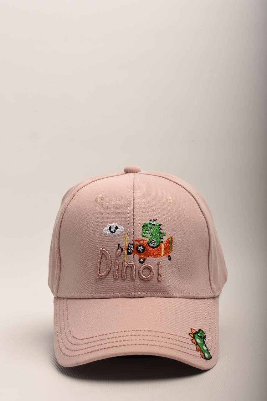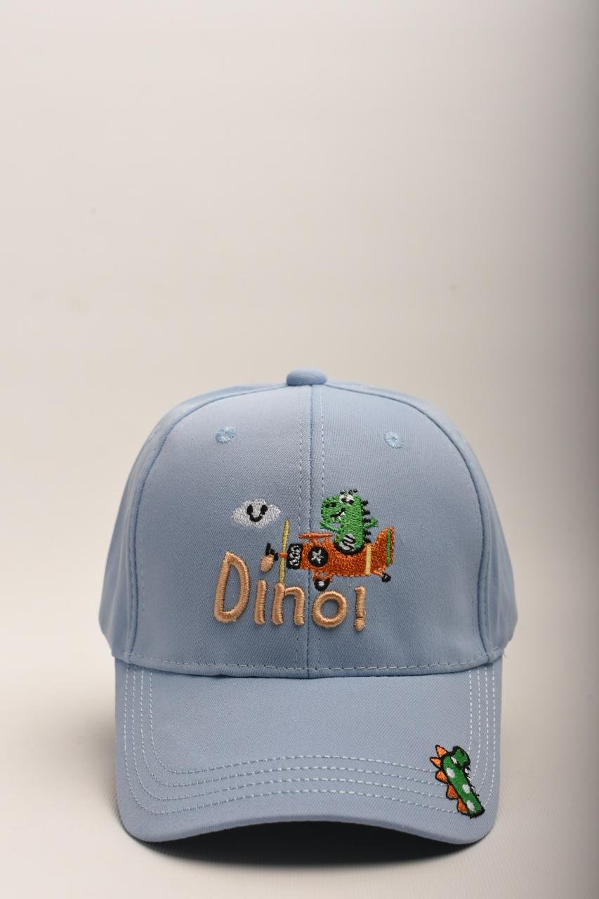 Disponible en celeste pastel y rosa pastel, ambos con el mismo diseño bordado de dinosaurio y detalles en la visera.